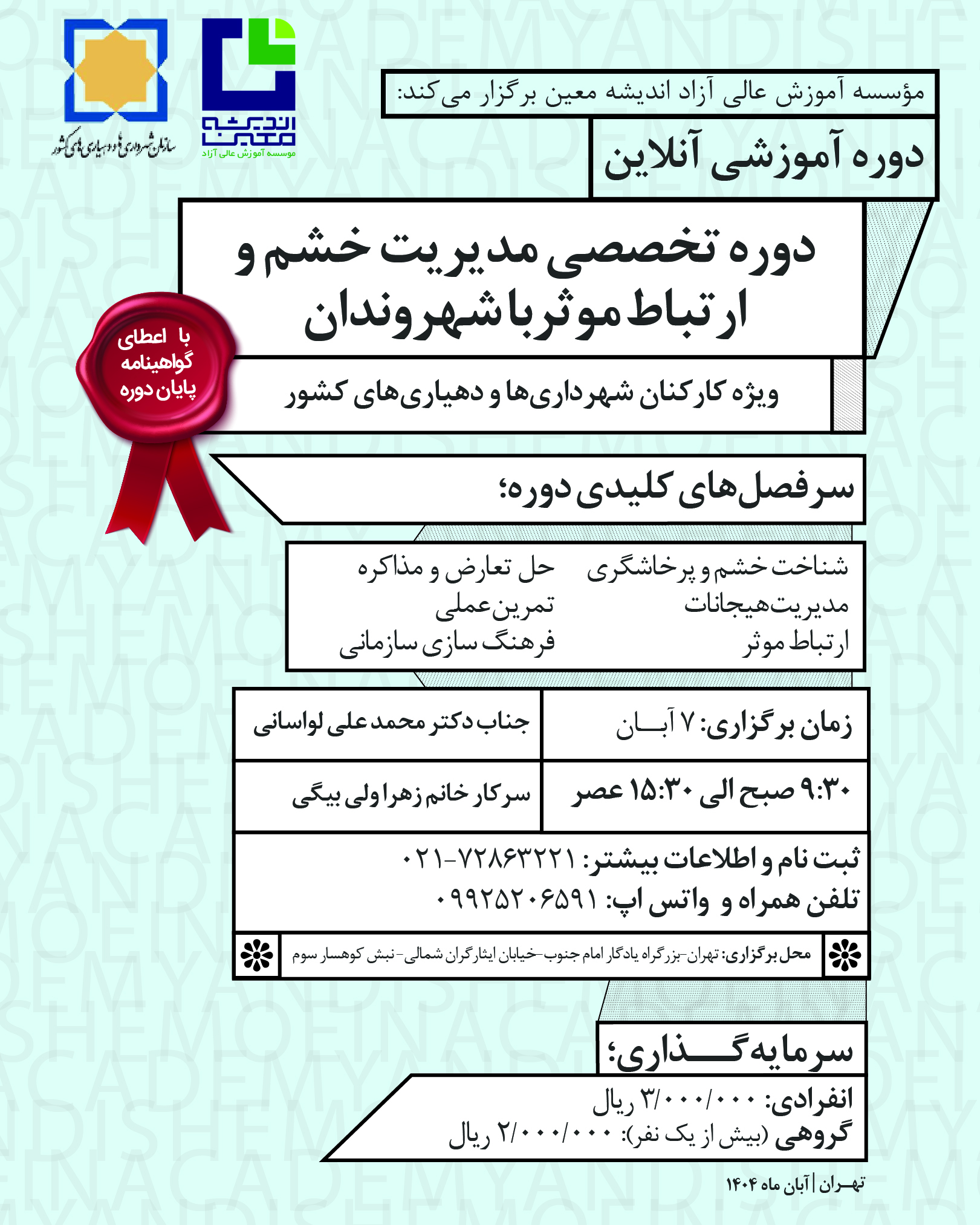در راستای ارتقای مهارتهای رفتاری و ارتباطی کارکنان شهرداریها و دهیاریها و برای بهبود کیفیت تعاملات اداری با شهروندان، مؤسسه آموزش عالی آزاد اندیشه معین اقدام به طراحی و برگزاری دوره آموزشی مدیریت خشم و ارتباط مؤثر با شهروندان نموده است.