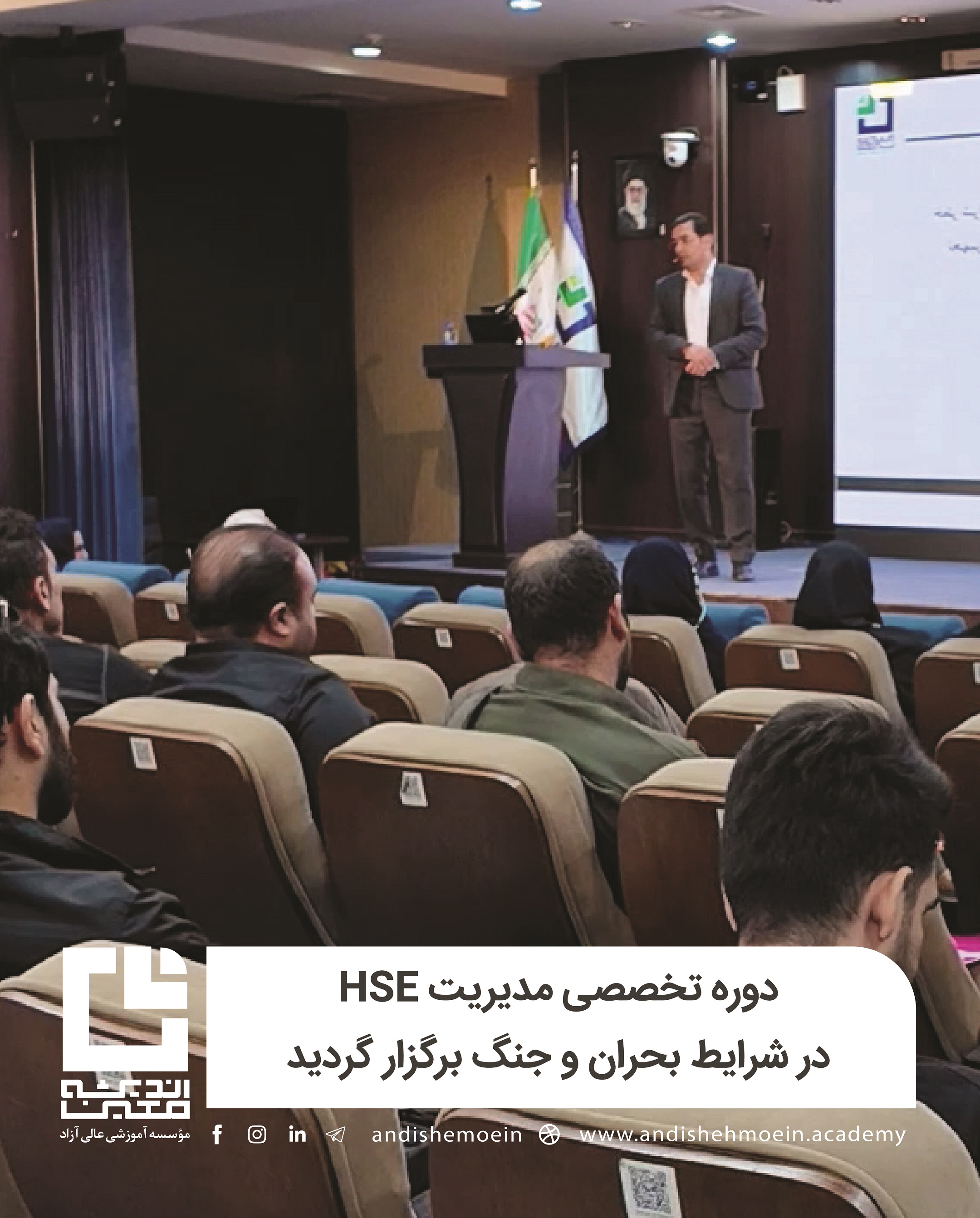 دوره تخصصی «مدیریت HSE در شرایط بحران و جنگ» روز پنجشنبه، هشتم آبانماه، با حضور مدیران و کارشناسان حوزههای ایمنی، بهداشت و محیطزیست در مؤسسه آموزش عالی آزاد اندیشه معین برگزار شد.